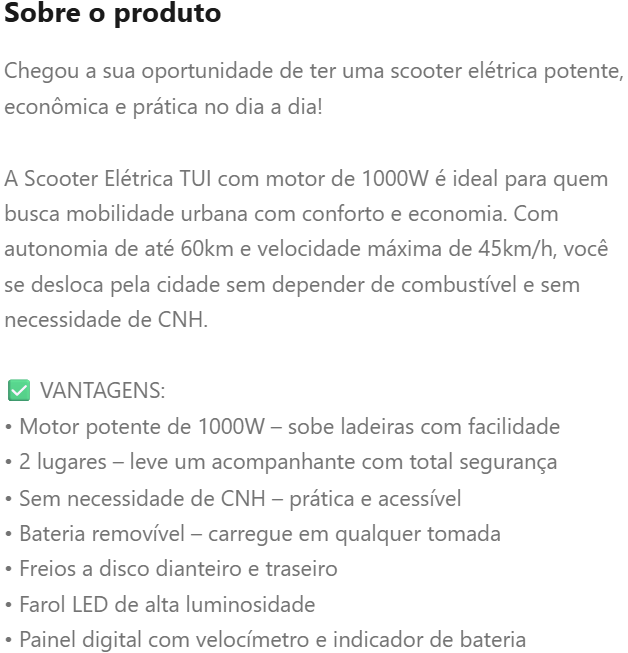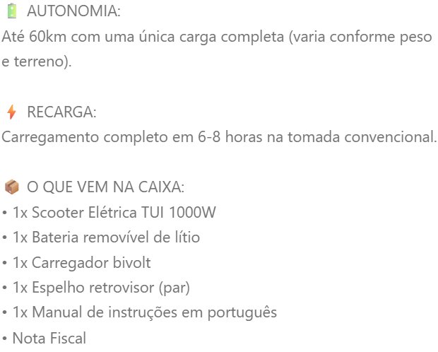 Não precisa de CNH e economizo uma fortuna! Motor de 1000W é muito potente, sobe ladeira tranquilo. Super silenciosa também.